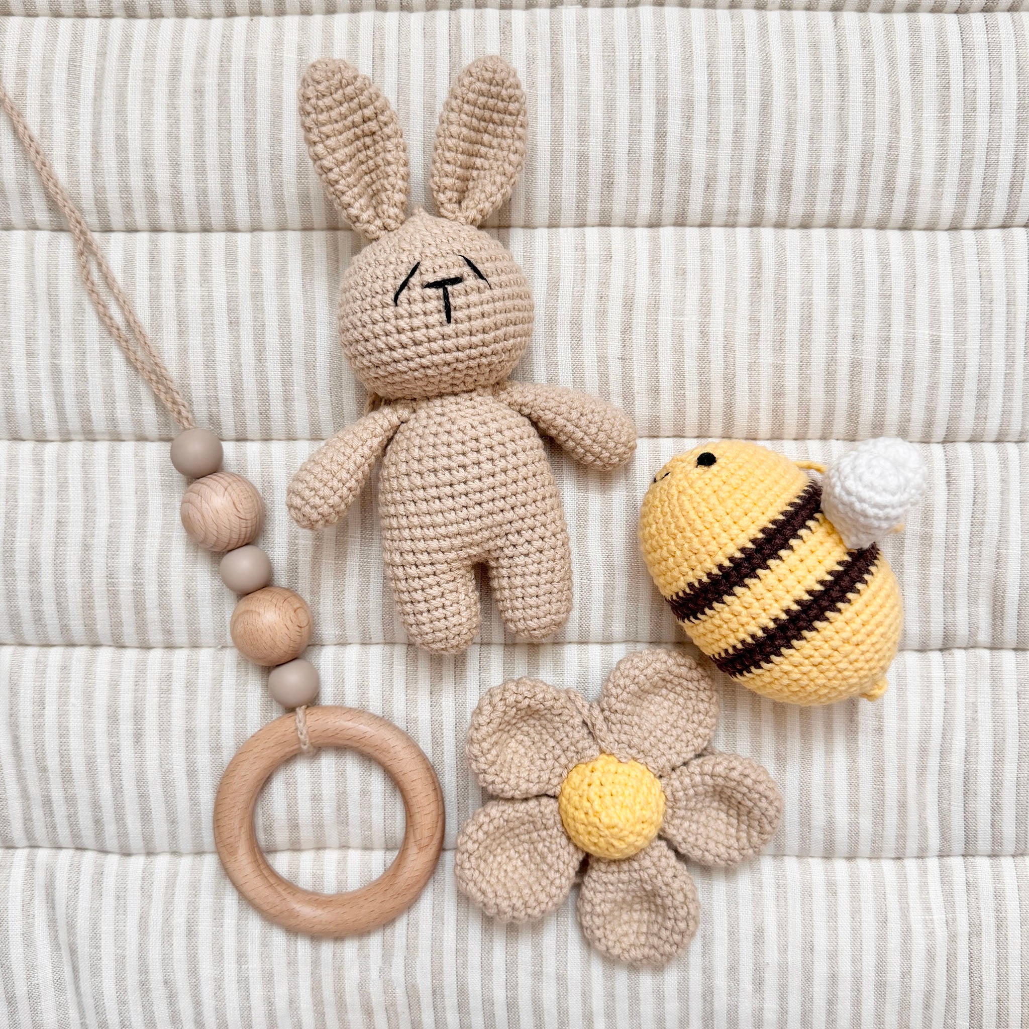 A nursery favourite, loved for its calm and modern aesthetic. Hand-crocheted bunny and bee toys come with soothing rattles inside, offering gentle sounds that encourage sensory development. Each piece is made from non-toxic materials, safe for little hands and mouths, in a neutral beige palette lifted with playful pops of yellow to brighten any space.