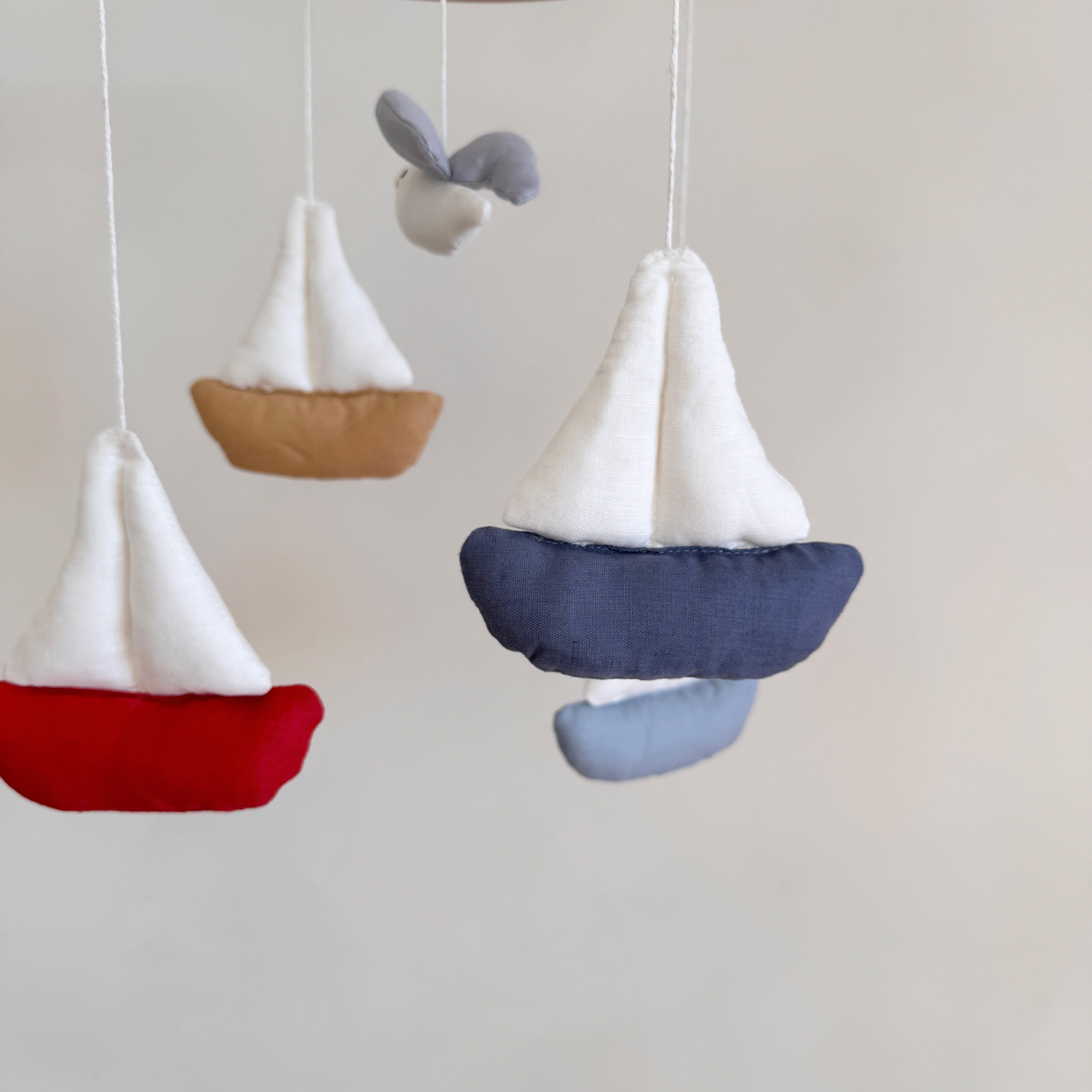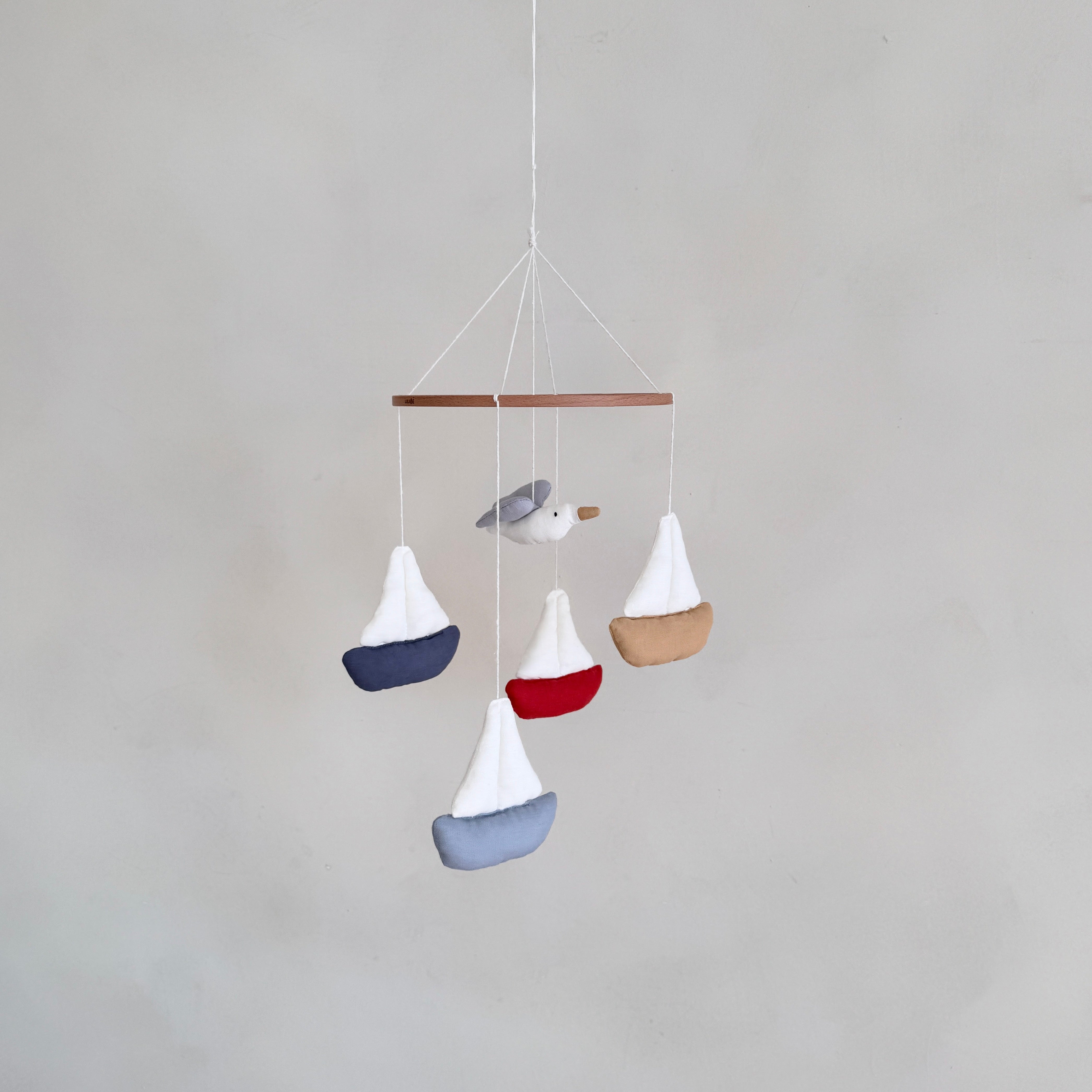 Lightweight and gently stuffed with cotton, this mobile is perfect for a boy’s nursery or any space needing a splash of nautical charm.