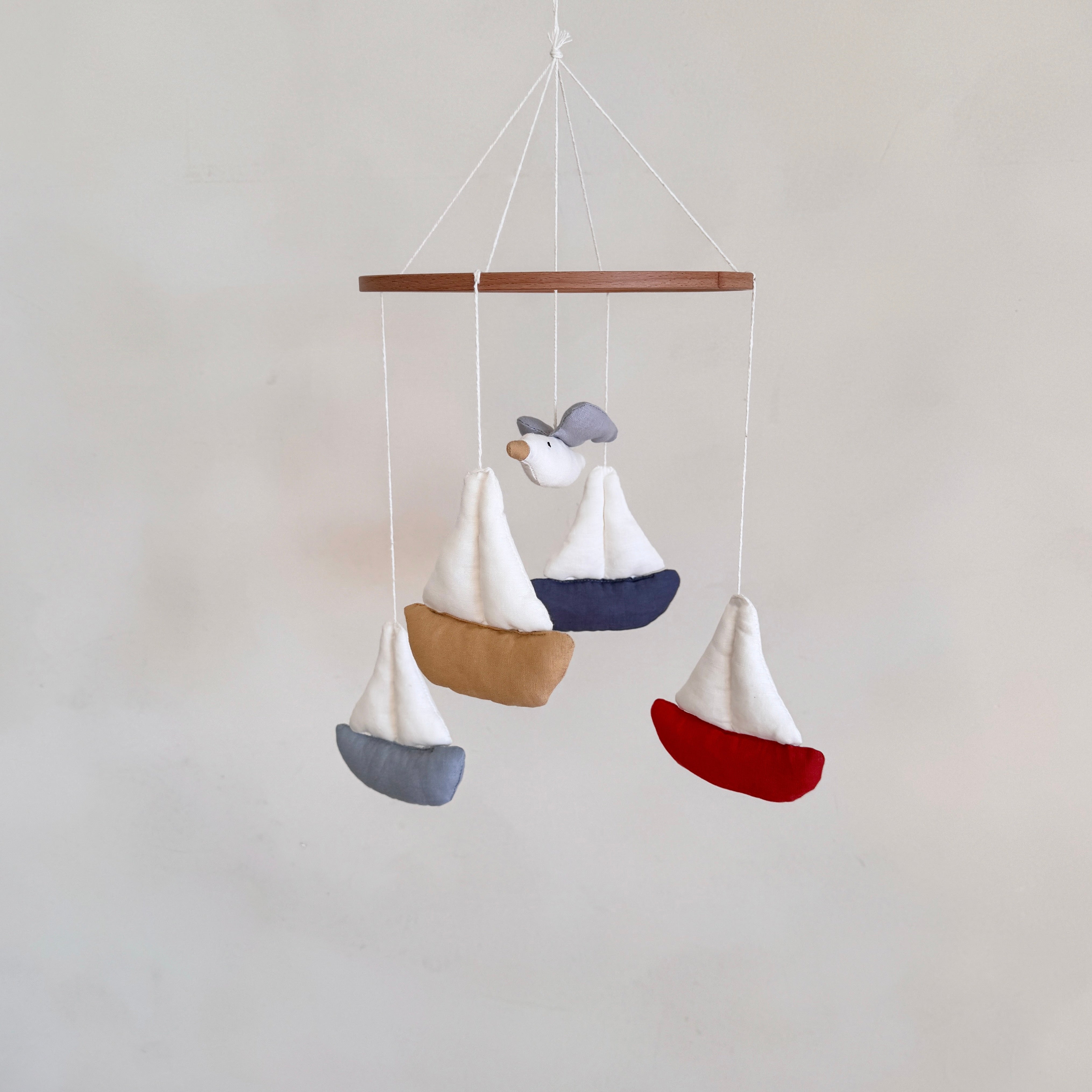 Featuring four handcrafted cotton boats in shades of blue, soft yellow, and red, with a friendly seagull soaring above, it's a playful nod to seaside adventures.