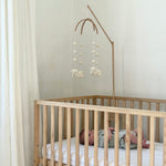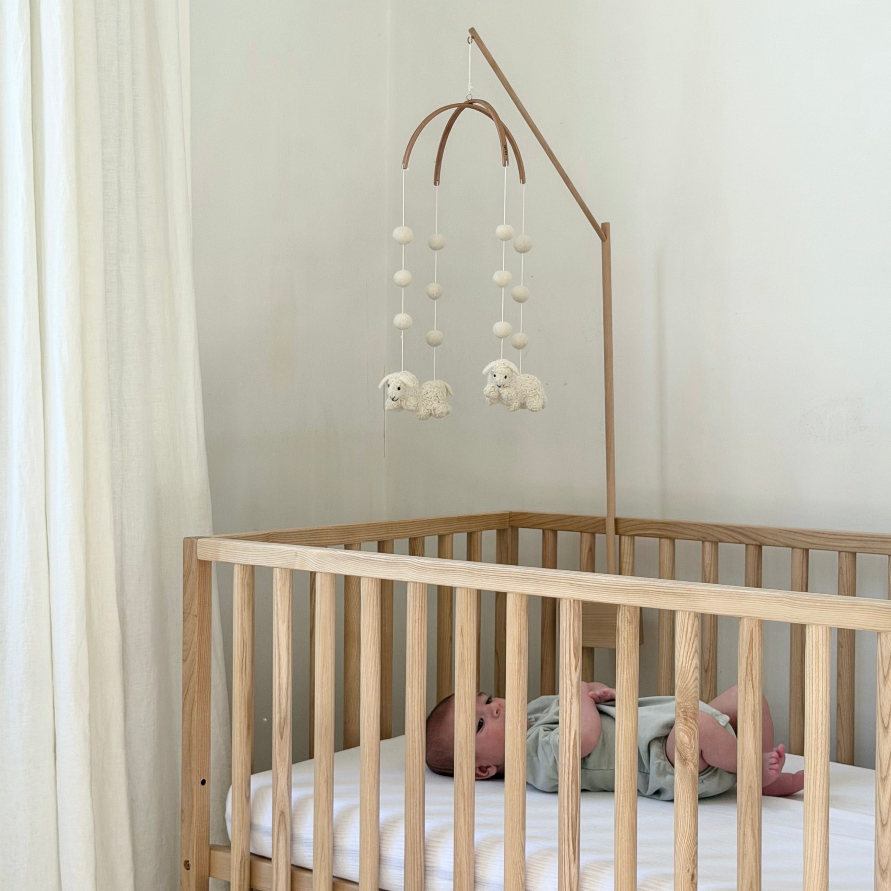 Lovingly handmade from natural wool, this mobile brings a gentle sense of calm to the nursery. Cream-toned sheep drift quietly overhead, inviting stillness and wonder with every subtle movement. Designed to complement a peaceful space, it’s a beautiful way to welcome your baby home.