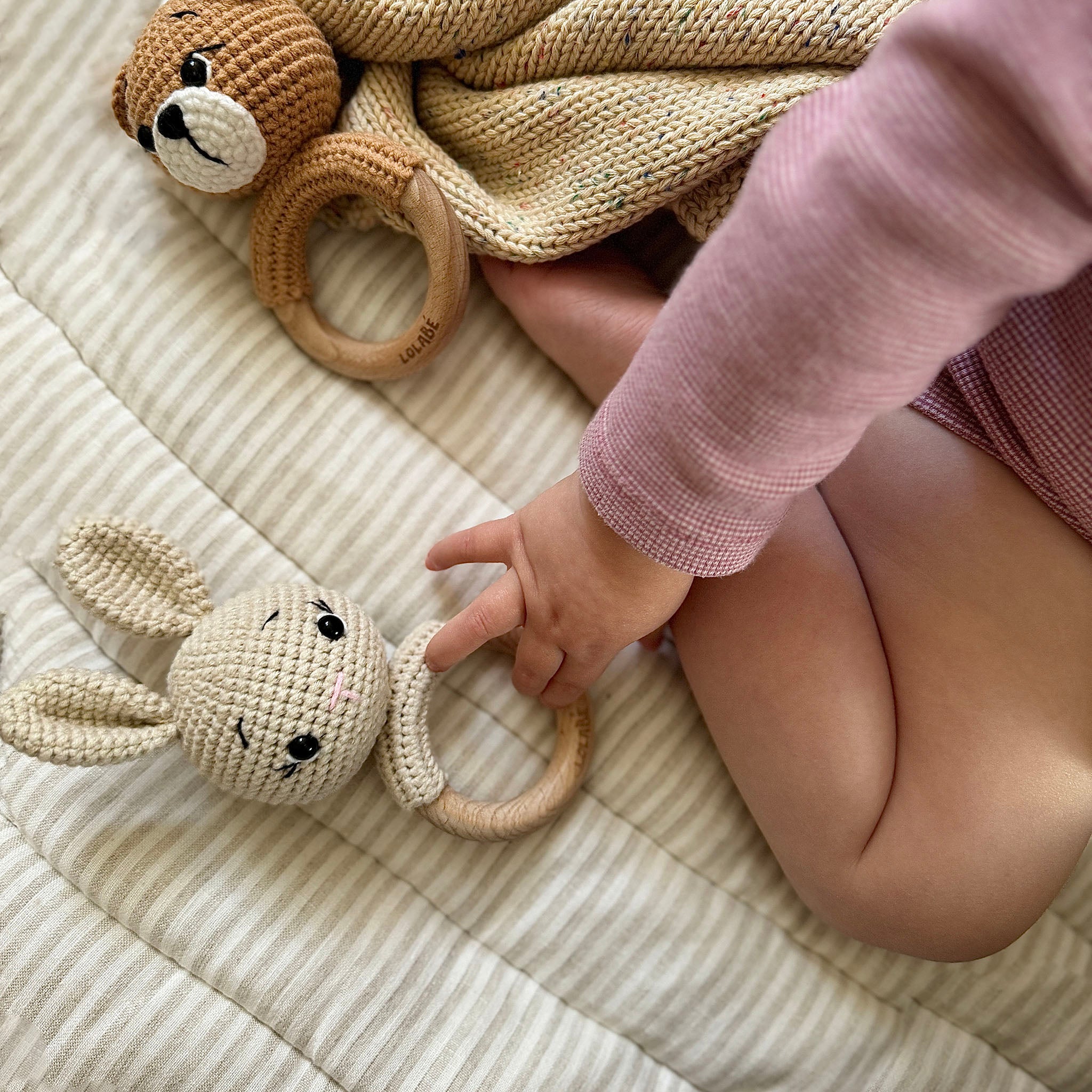 Meet Flopsy - the adventurous bunny, a delightful handmade rattle perfect for tiny hands and curious minds. Crafted with love from 100% cotton and smooth beech wood, this bunny is soft, safe, and non-toxic, making it an ideal companion for your little one's playtime.