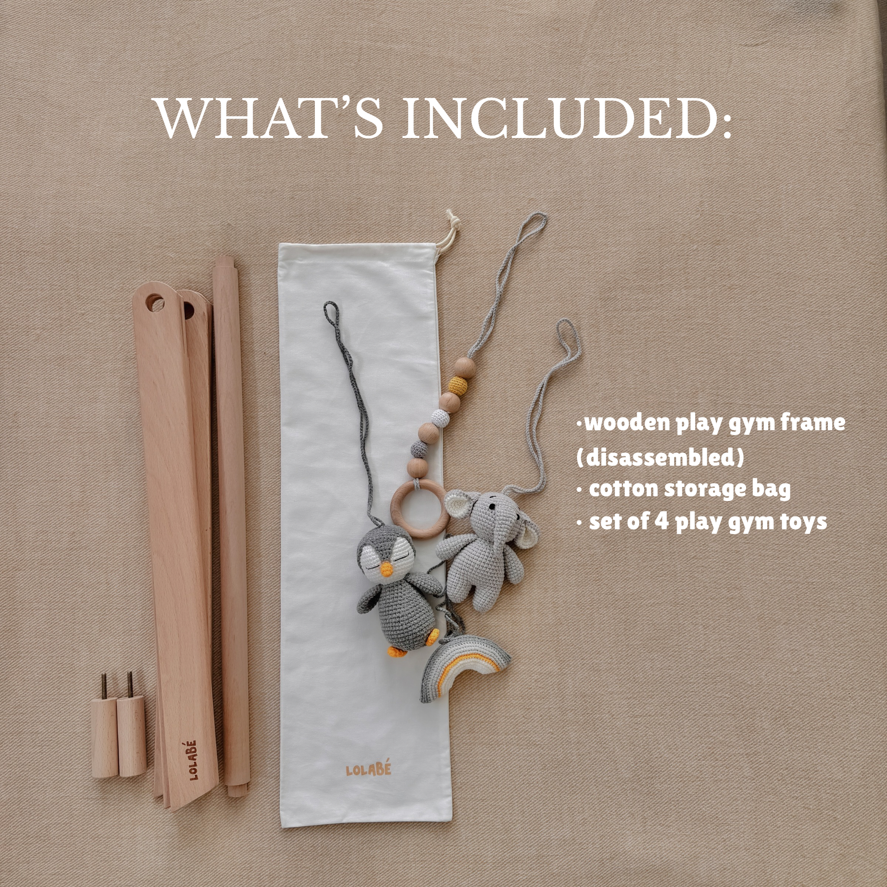 3. Your gym comes with a thick cotton bag for easy storage. You can use it to keep the frame and toys together when not in use.