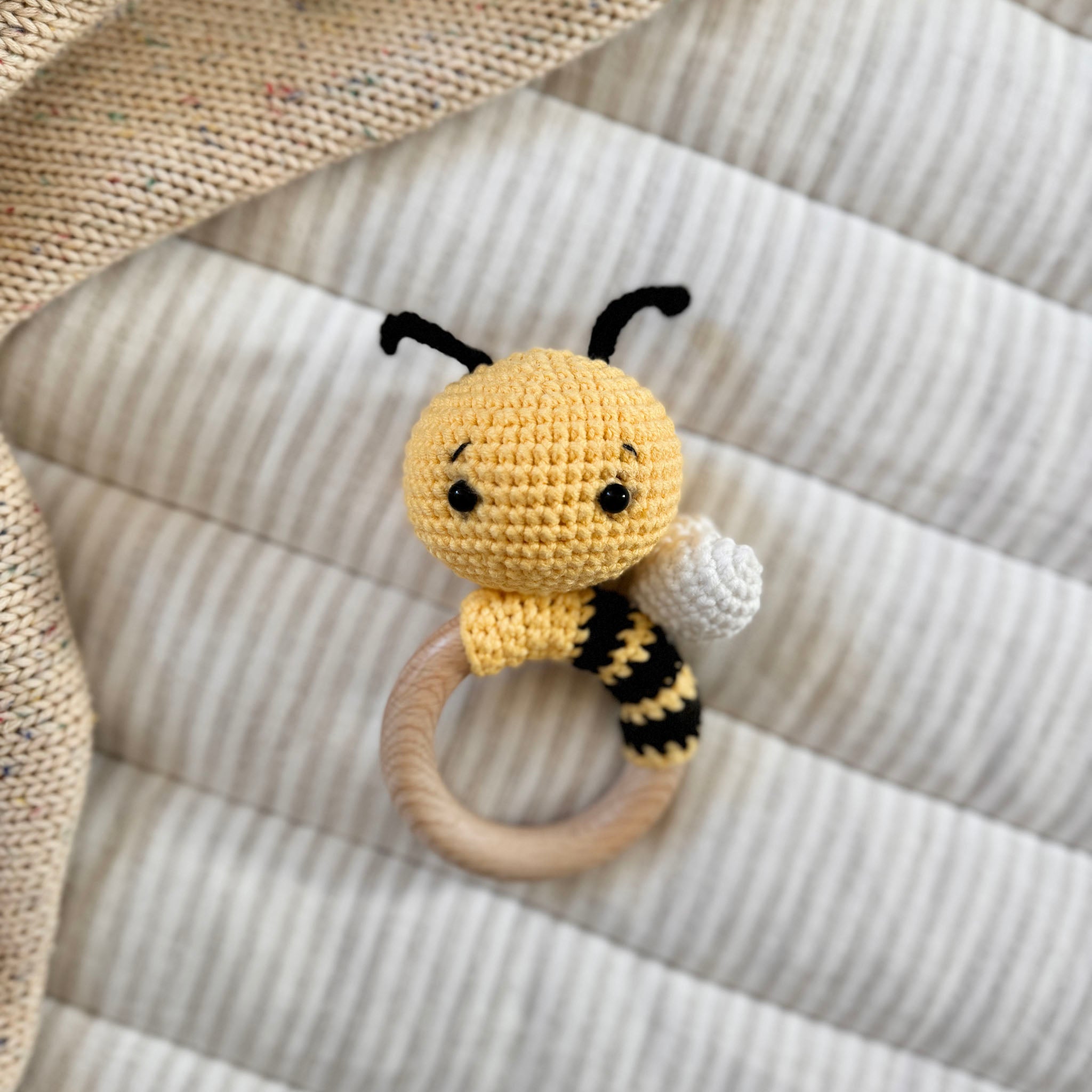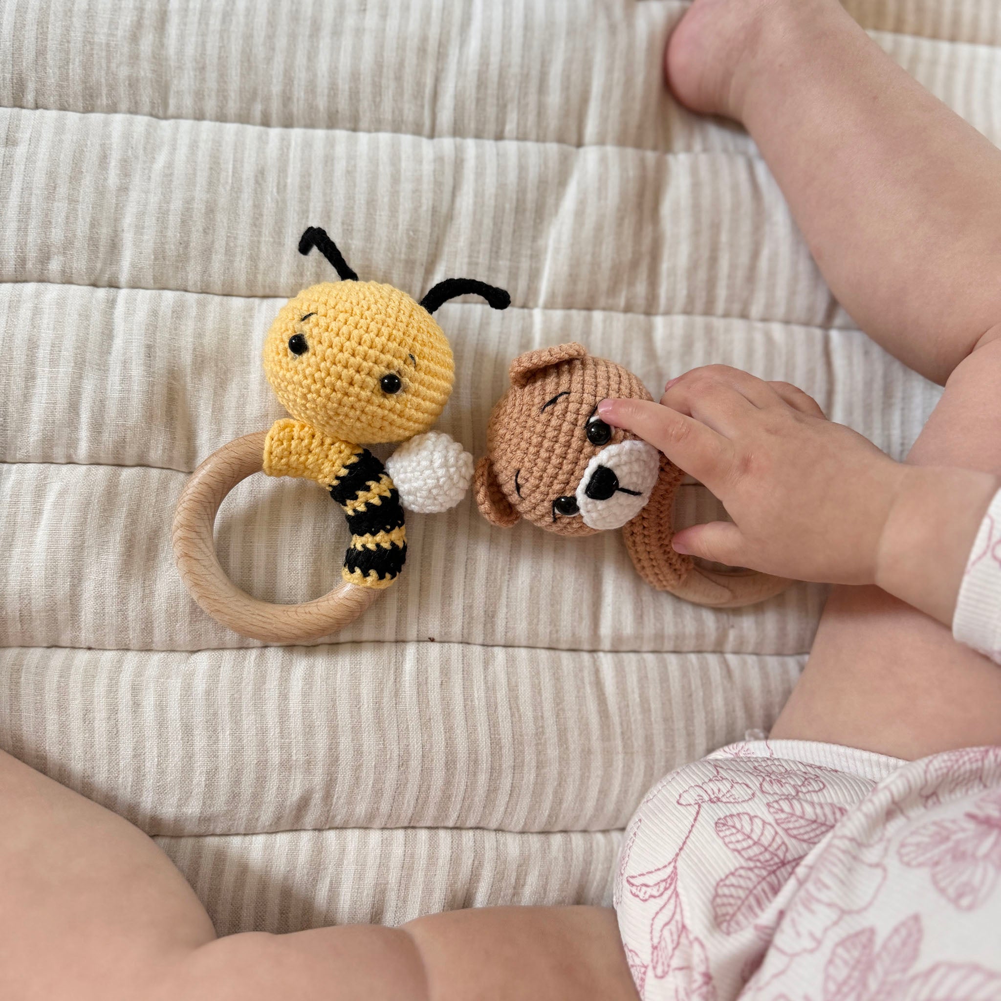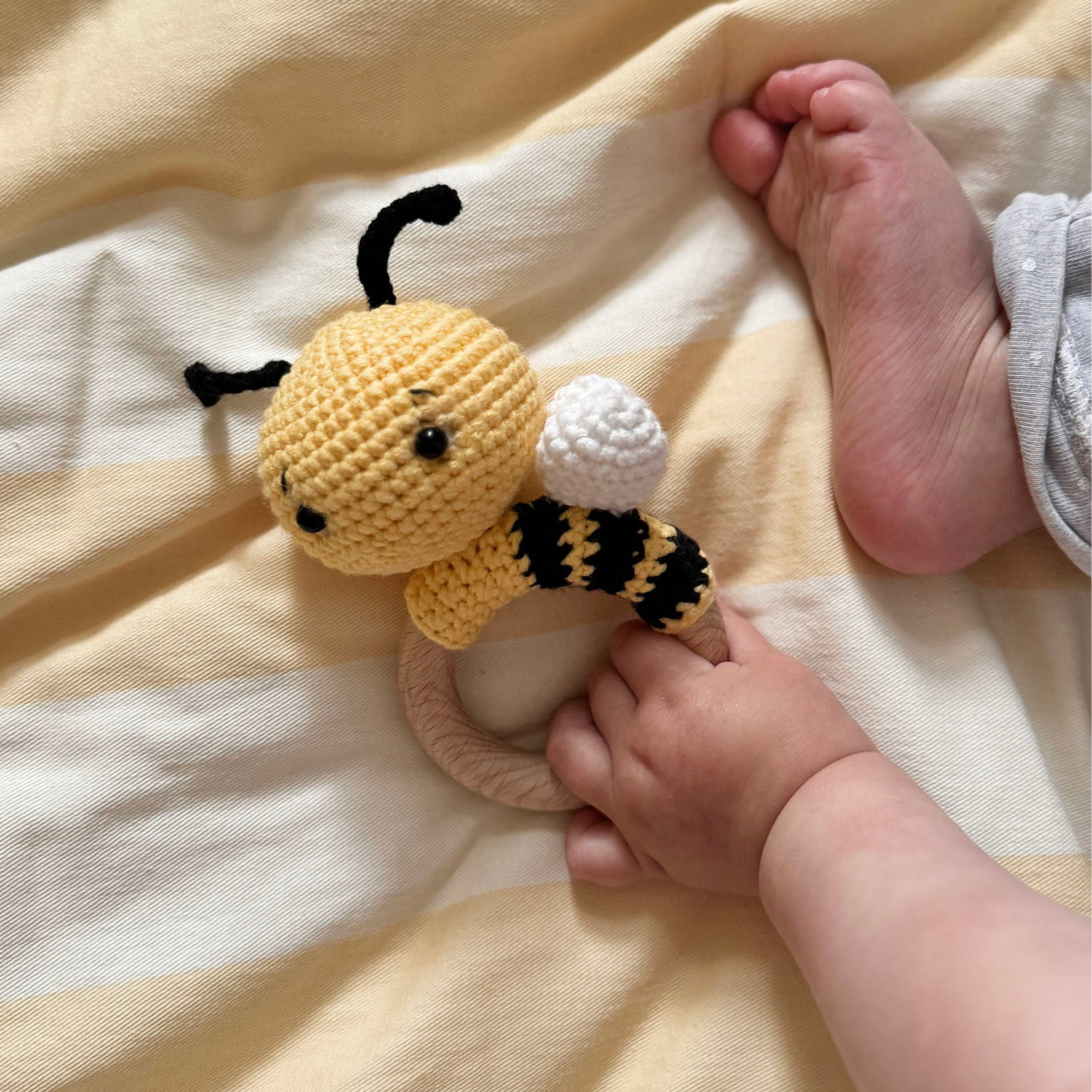 Meet Maya the bee rattle, crafted from soft, natural cotton. This adorable and charming rattle is the perfect addition to your little one's playtime, and it pairs beautifully with our Bunny and Bee baby gym set. Designed to delight tiny hands, Maya makes a sweet companion for any nursery.