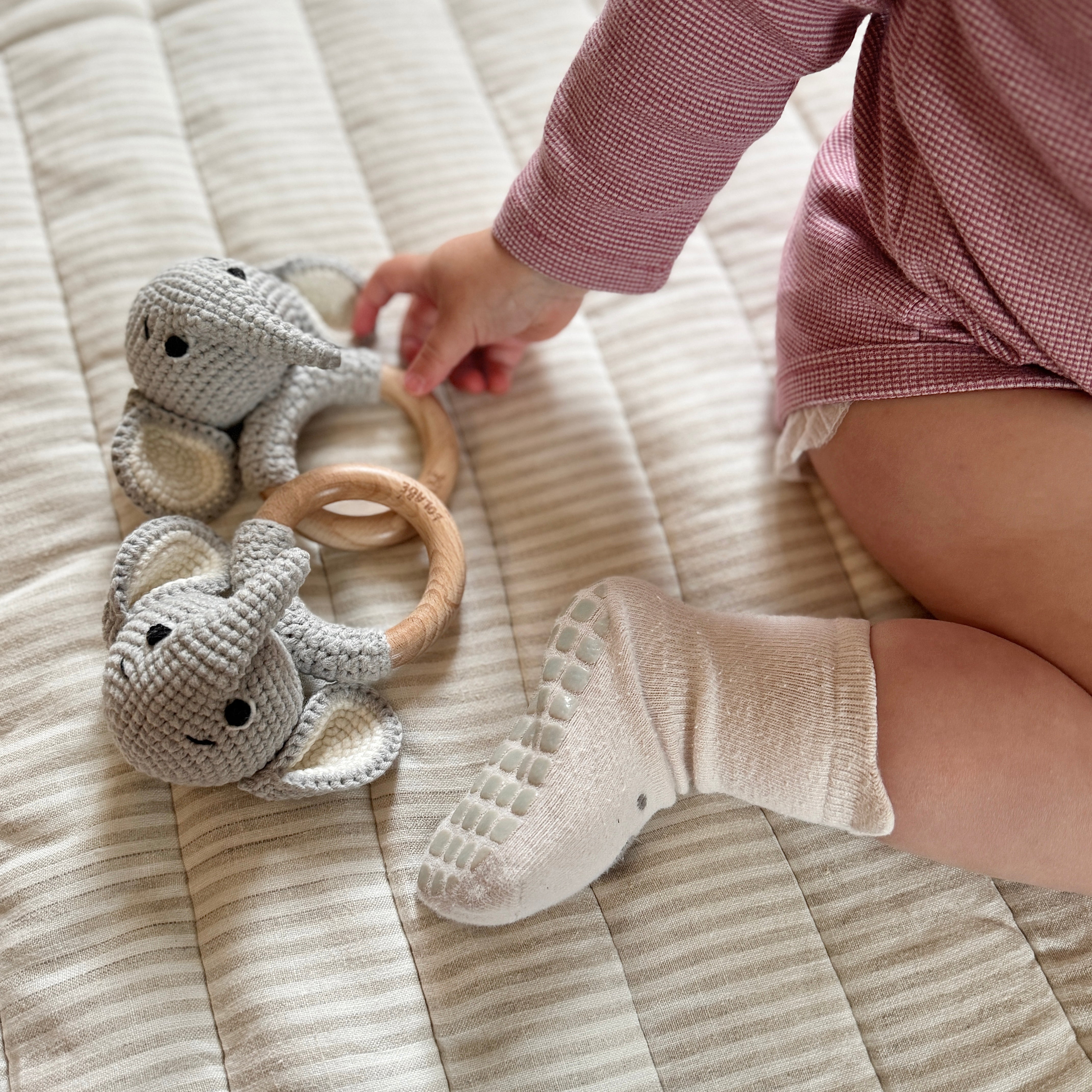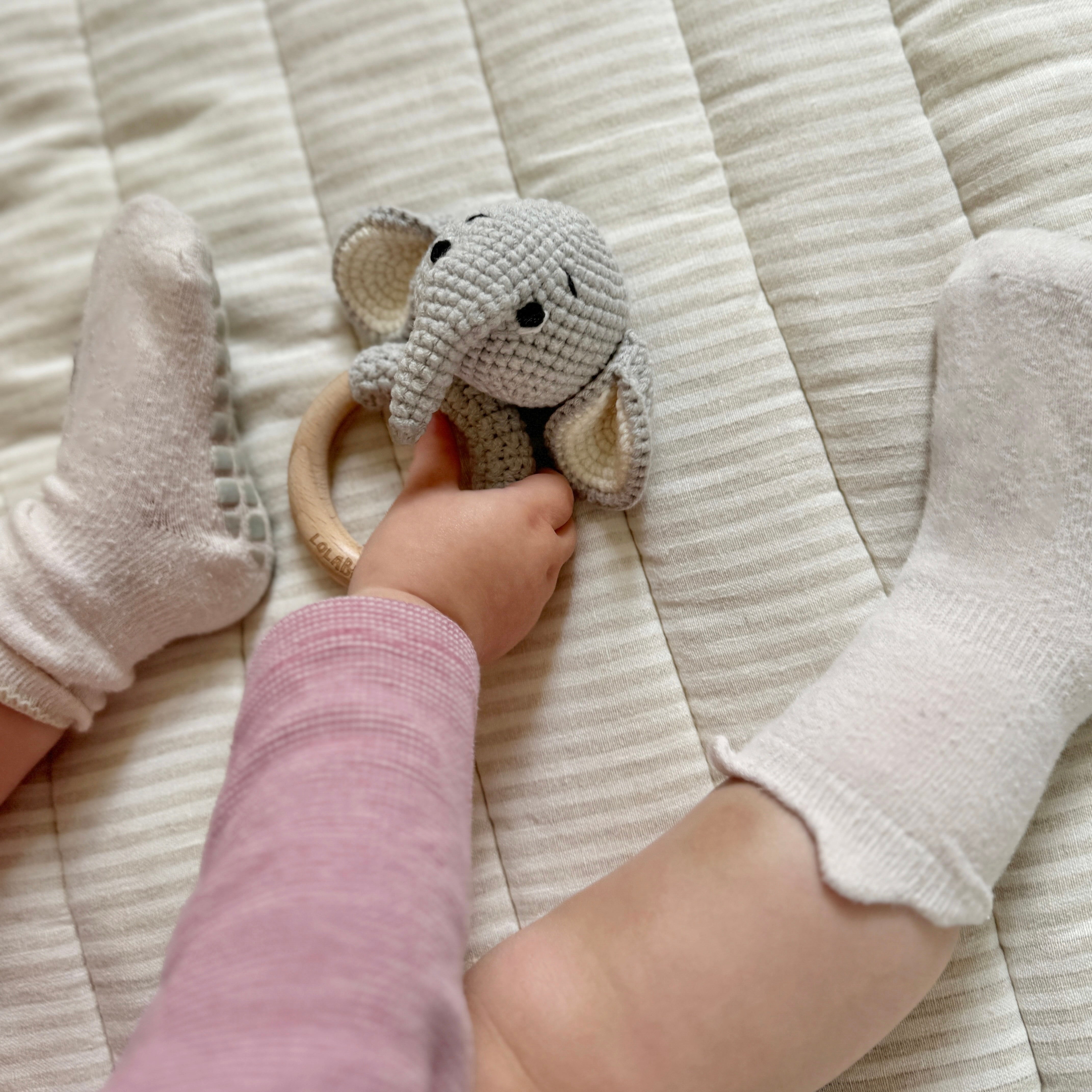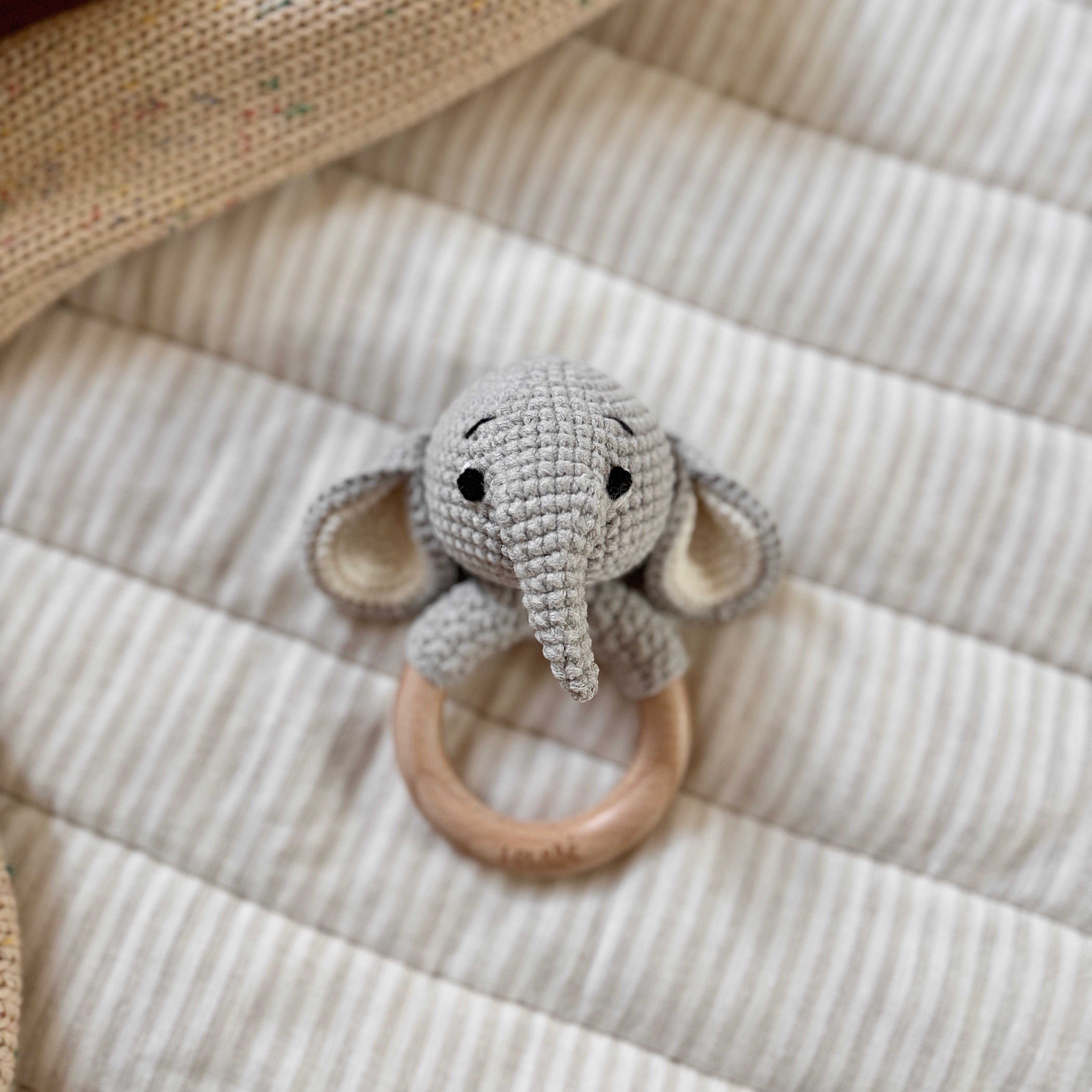 Introducing Zola the wise elephant, a handmade crochet rattle designed to inspire wonder and comfort in little hands. Lovingly crafted from 100% cotton and beech wood, Zola is safe, non-toxic, and durable for everyday play.